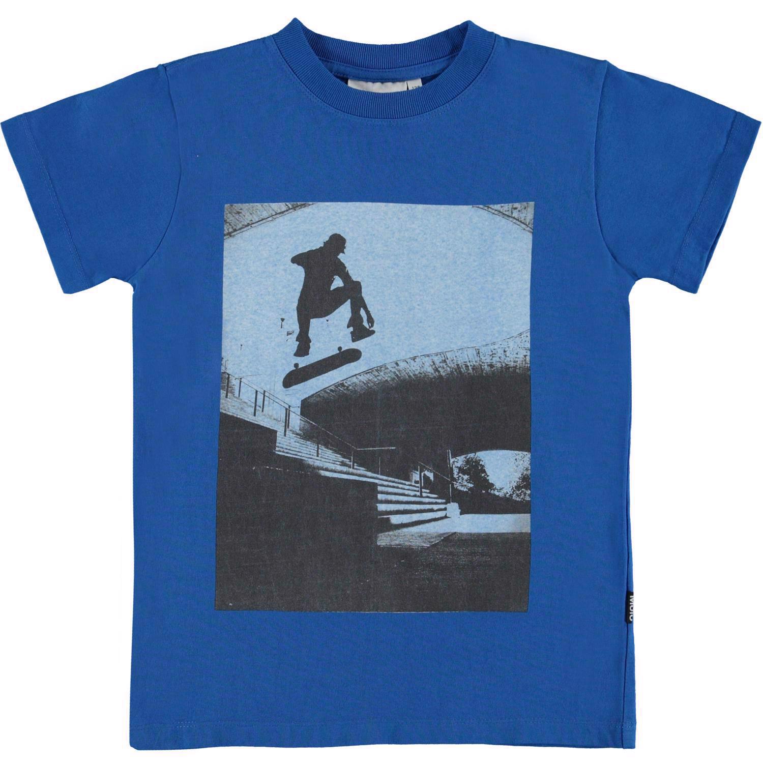 Road ist ein blaues T-Shirt mit einem Foto eines Skateboarders mitten im Sprung auf dem Bauch.