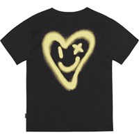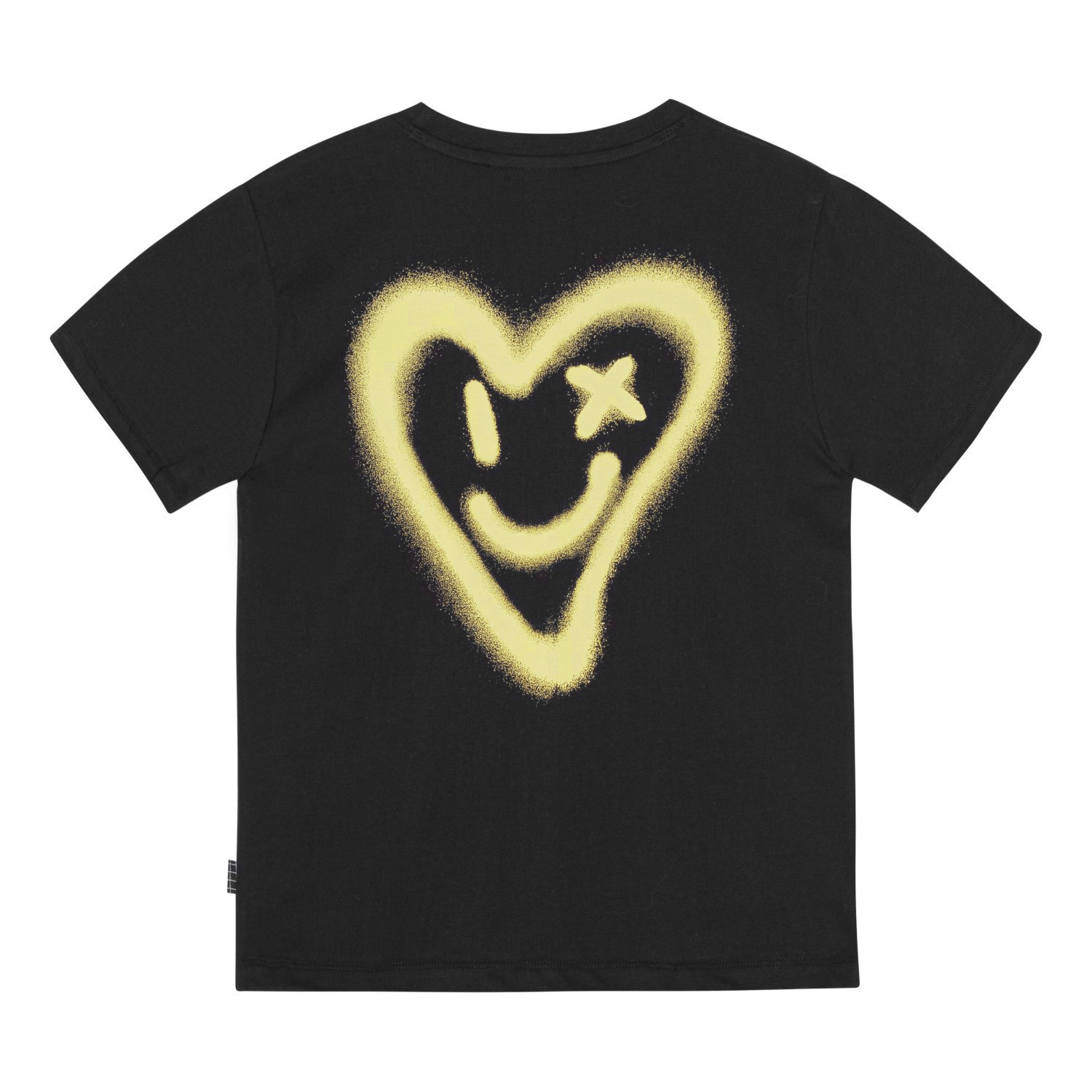 Rodney ist ein schwarzes T-Shirt mit gelbem Platzierungsdruck auf der Vorder- und Rückseite, hergestellt aus 100% Öko-Baumwolle. Auf der Vorderseite befindet sich ein aufgesprühtes kleines gelbes Herz, das Sie anlächelt und zwinkert, während auf der Rückseite eine große Version desselben Herzens aufgedruckt ist. Rodney hat einen Rundhalsausschnitt, Rippbündchen am Hals und eine übergroße Passform.