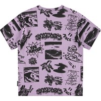 Lila T-Shirt aus Öko-Baumwolle mit kurzen Ärmeln und geripptem Ausschnitt. Das T-Shirt hat eine lockere Passform mit einem schwarzen Allover-Druck der Themen der Kollektion: Aliens, Naturgewalten, Surfen, Bananen, Frieden, etc.