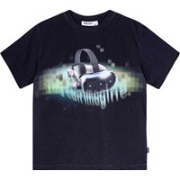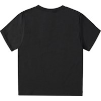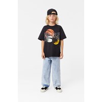 Schwarzes T-Shirt aus Öko-Baumwolle mit kurzen Ärmeln, Rundhalsausschnitt und geripptem Saum am Hals. Das T-Shirt hat eine übergroße Passform und einen platzierten Druck auf der Vorderseite. Der Druck zeigt drei verschiedene Bälle aus drei verschiedenen Sportarten und darüber steht der Text "World Play".
