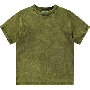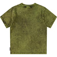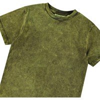 Grünes T-Shirt aus Öko-Baumwolle mit kurzen Ärmeln und geripptem Ausschnitt. Das T-Shirt hat eine lockere Passform und einen gewaschenen Effekt, der dem grünen Farbton verschiedene Schattierungen verleiht.