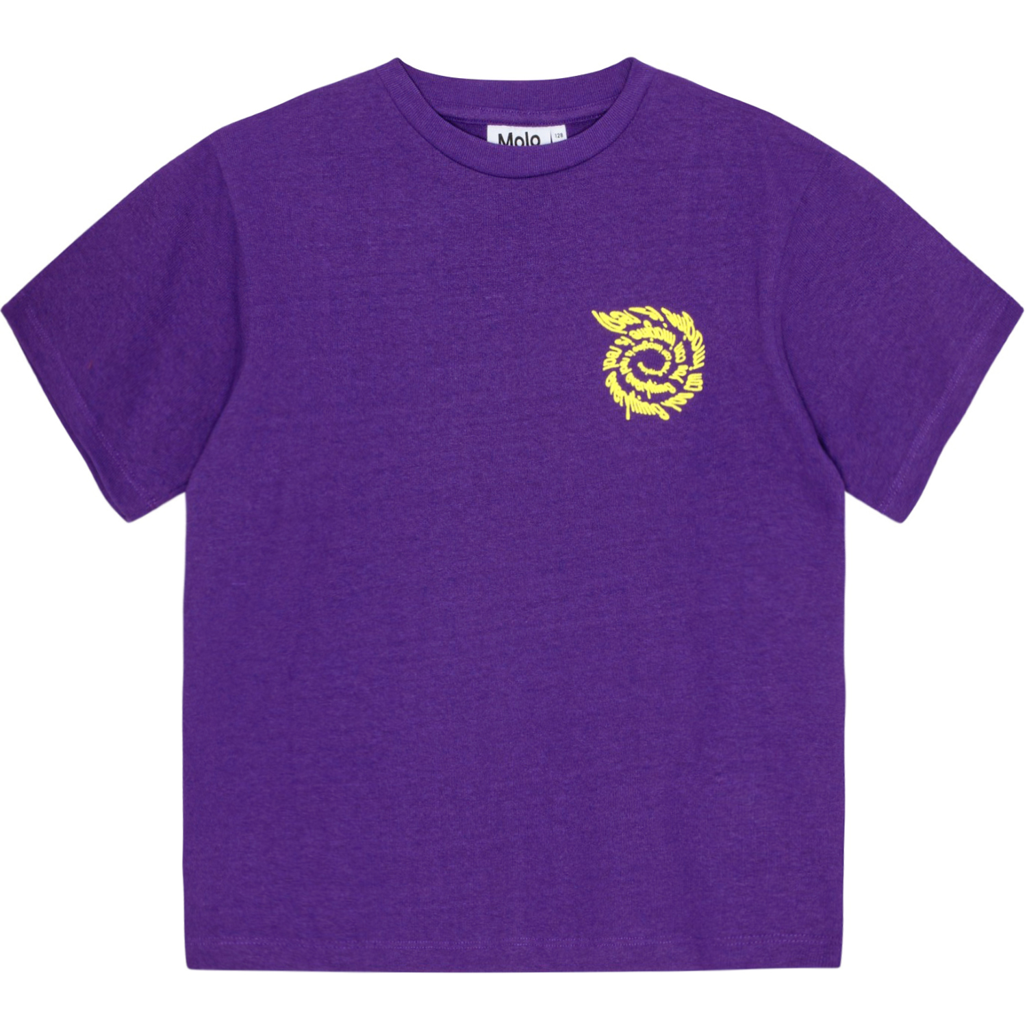 Lila T-Shirt aus Öko-Baumwolle mit kurzen Ärmeln, Rundhalsausschnitt und geripptem Rand am Hals. Das T-Shirt hat eine übergroße Passform und einen platzierten Druck auf der Vorder- und Rückseite. Der gelbe Textdruck bildet eine Spirale mit den Worten "Everything you can Imagine is Real". Kleine Version auf der Vorderseite, große auf der Rückseite.