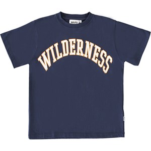 Rodney ist ein blaues T-Shirt mit dem Text „Wilderness“ auf der Vorderseite. Das T-Shirt hat eine übergroße und lockere Passform.