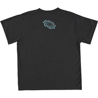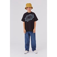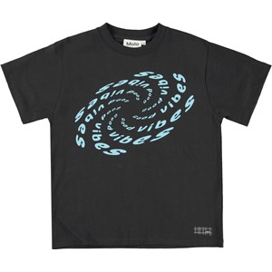 Rodney ist ein schwarzes T-Shirt mit dem Text „Good Vibes“ in Blau, das sowohl auf der Vorder- als auch auf der Rückseite ein Muster bildet. Das T-Shirt hat eine übergroße und lockere Passform.