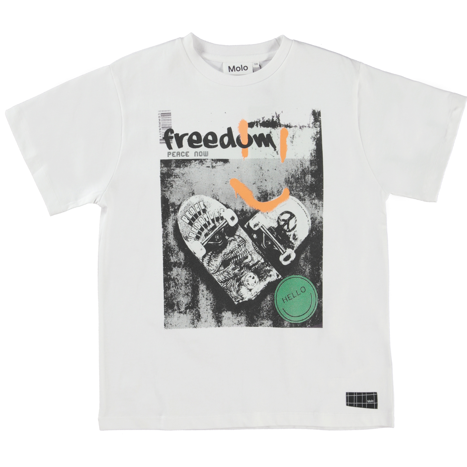 Rodney ist ein weißes T-Shirt mit einem Aufdruck eines zerbrochenen Skateboards, das ein Herz formt, und dem Text „freedom“. Das T-Shirt hat eine kastige Passform.