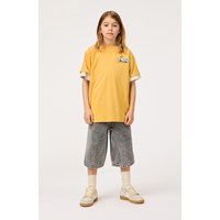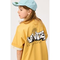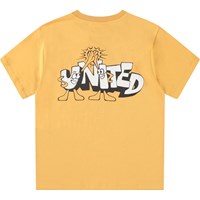 Gelbes T-Shirt aus Öko-Baumwolle mit kurzen Ärmeln und geripptem Ausschnitt. Das T-Shirt hat eine lockere Passform mit dem lebendigen Text "United" auf der Vorder- und Rückseite.