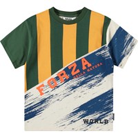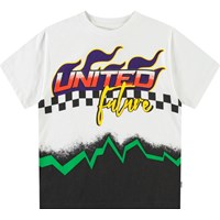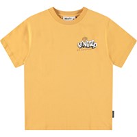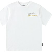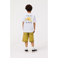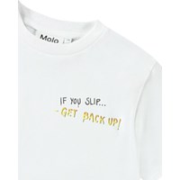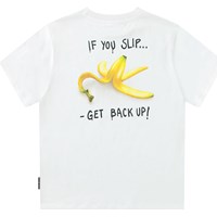 Weißes T-Shirt aus Öko-Baumwolle mit kurzen Ärmeln und geripptem Ausschnitt. Das T-Shirt hat eine lockere Passform mit dem schönen Text "If you slip.... Get back up!" und einer gelben Bananenschale auf der Rückseite.