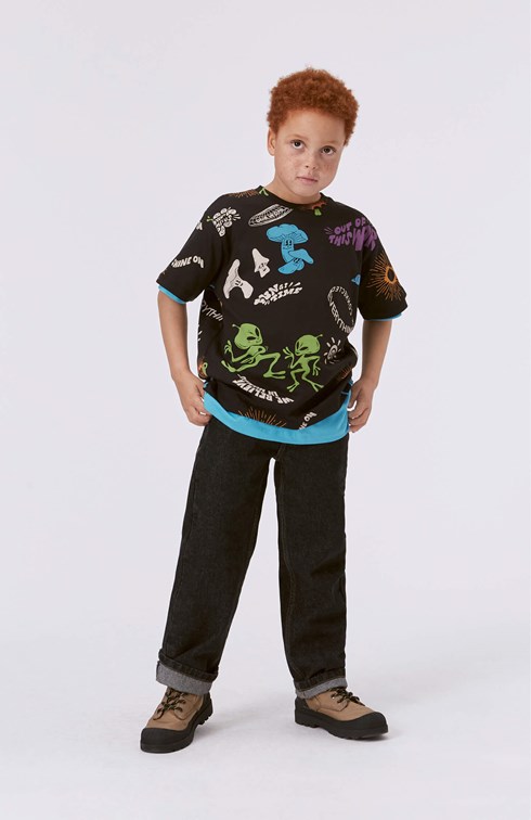 Schwarzes T-Shirt mit mehrfarbigem Placement-Print. Der Druck zeigt Elemente aus einer Auswahl der Prints der Kollektion. Begrüßen Sie die tanzenden Außerirdischen, die strahlende Sonne, alle Planeten, Lächeln, schlagende Herzen, Friedenszeichen und fröhliche Pilze. War für eine Party! Dieses T-Shirt besteht aus 100% Öko-Baumwolle, hat kurze Ärmel, einen Rundhalsausschnitt mit gerippten Bündchen und hat eine übergroße Passform.