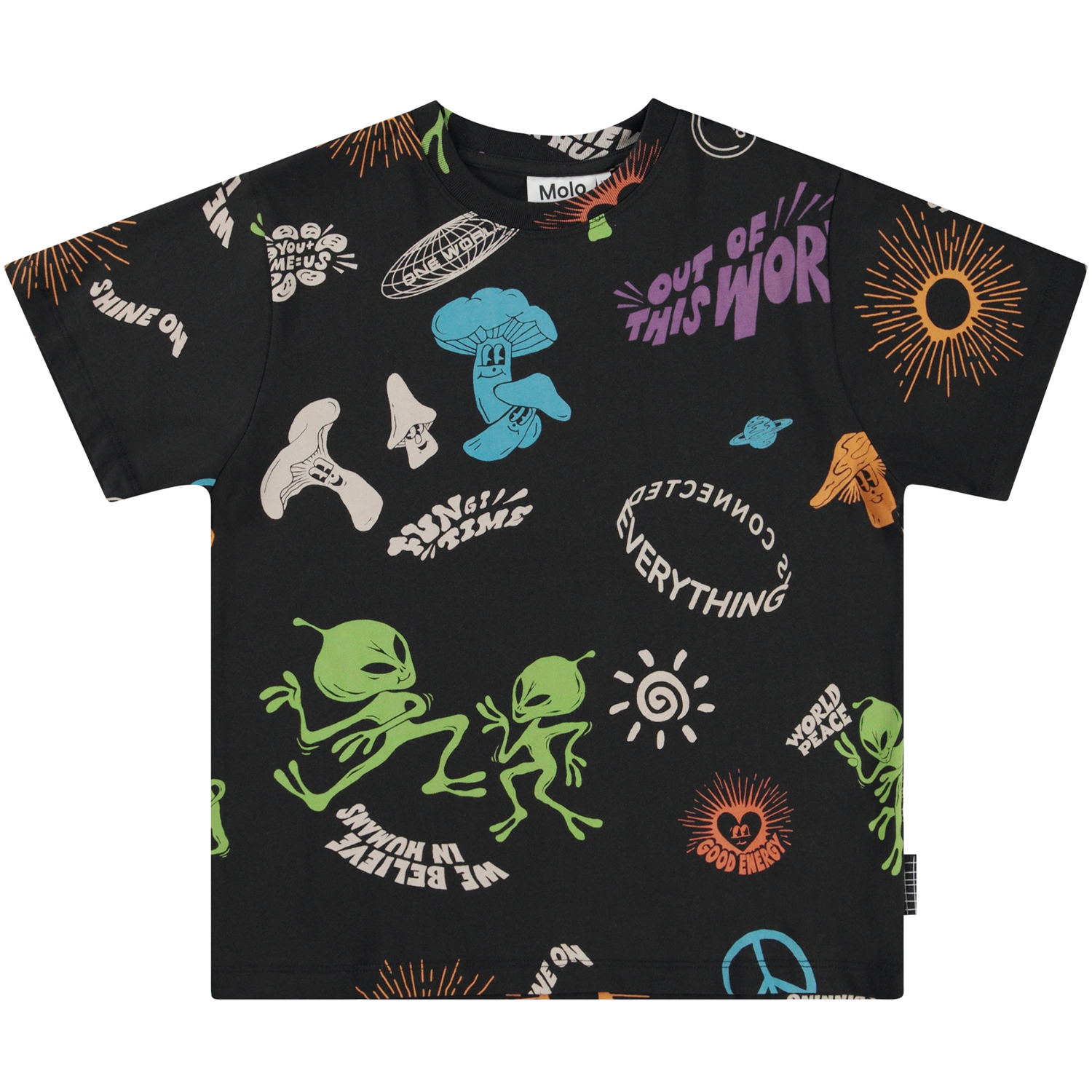 Schwarzes T-Shirt mit mehrfarbigem Placement-Print. Der Druck zeigt Elemente aus einer Auswahl der Prints der Kollektion. Begrüßen Sie die tanzenden Außerirdischen, die strahlende Sonne, alle Planeten, Lächeln, schlagende Herzen, Friedenszeichen und fröhliche Pilze. War für eine Party! Dieses T-Shirt besteht aus 100% Öko-Baumwolle, hat kurze Ärmel, einen Rundhalsausschnitt mit gerippten Bündchen und hat eine übergroße Passform.