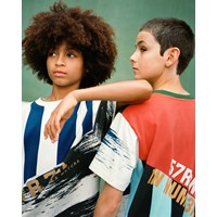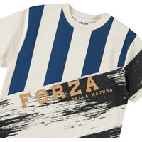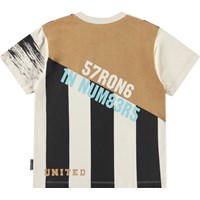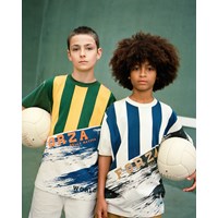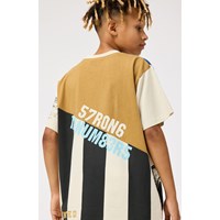 Off-weißes T-Shirt aus Öko-Baumwolle mit kurzen Ärmeln und geripptem Ausschnitt. Das T-Shirt hat eine lockere Passform und einen coolen Print, inspiriert von der Welt des Fußballs.