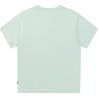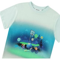 Oversized T-Shirt aus Öko-Baumwolle mit kurzen Ärmeln und geripptem Ausschnitt. Das T-Shirt ist hellblau mit einem Aufdruck von lustigen Kindheitserinnerungen.