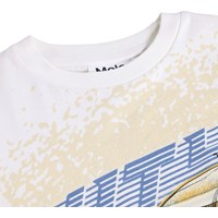 Weißes T-Shirt aus Öko-Baumwolle mit kurzen Ärmeln und geripptem Halsausschnitt. Das T-Shirt hat eine lockere Passform mit einem Druck eines Rennwagens und dem Text Unity.