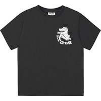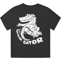 Schwarzes T-Shirt aus Öko-Baumwolle mit kurzen Ärmeln, einem Rundhalsausschnitt und einem gerippten Rand am Hals. Das T-Shirt hat eine übergroße Passform und einen platzierten Schablonendruck auf der Vorder- und Rückseite. Der Druck zeigt ein schwarzes Krokodil auf einem Skateboard, auch bekannt als "Skater Gater".