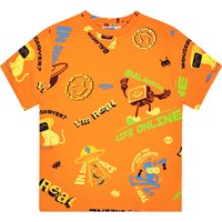 Schwarzes und cremefarbenes T-Shirt aus Öko-Baumwolle mit kurzen Ärmeln, Rundhalsausschnitt und geripptem Saum am Hals. Das T-Shirt hat eine übergroße Passform und verfügt über einen Allover-Print. Der Print ist eine schwarz-weiße Zeitungscollage mit Bildern und Artikeln über verschiedene Sportarten.