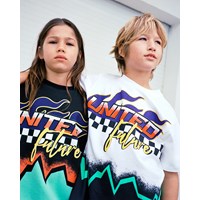 Weißes T-Shirt aus Öko-Baumwolle mit kurzen Ärmeln und geripptem Ausschnitt. Das T-Shirt hat eine lockere Passform und einen Aufdruck, der auf die Motocross-Welt verweist, zusammen mit dem Text 'United Future'.