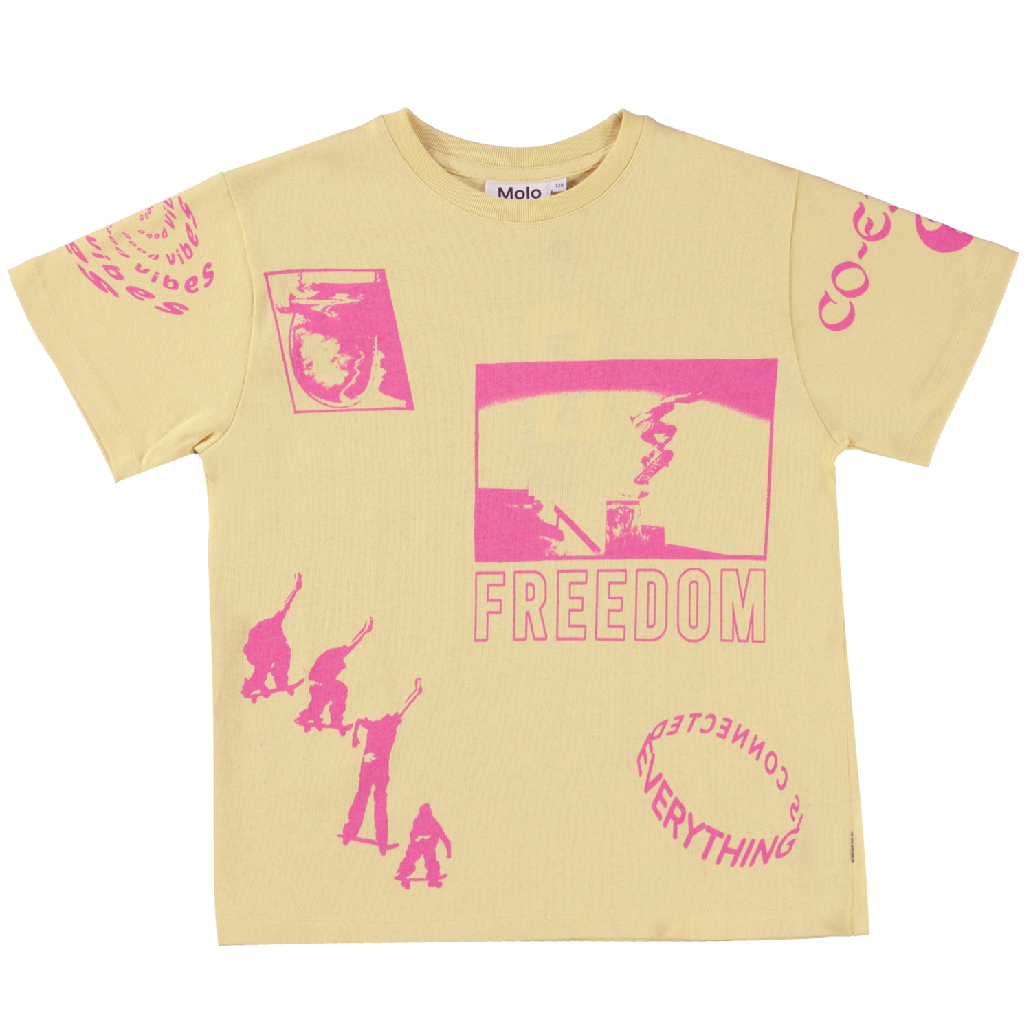 Gelbes T-Shirt mit pinkfarbenem Placement-Print, inspiriert vom Skateboarding. Hier kommen grafische Elemente wie Fotos, grafische Linien, Symbole und kleine Textschnipsel zum Einsatz, die zusammen eine grafische Collage in zwei Tönen ergeben. Dieses T-Shirt besteht aus 100% Baumwolle, kurzen Ärmeln, einen Rundhalsausschnitt mit Rippbündchen und hat eine übergroße Passform.