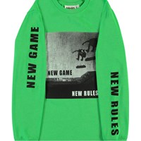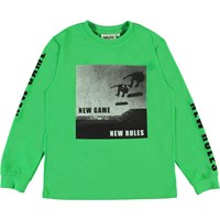 Rogert ist eine coole grüne Bluse mit Skater-Druck auf der Vorderseite sowie dem Text 'New Game - New Rules' auf der Vorderseite und den Ärmeln.