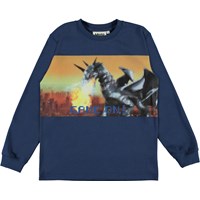 Rogert ist eine blaue Bluse mit Druck, die von einem pixeligen Computerspiel mit Drachen und dem Text 'Game on' inspiriert ist.