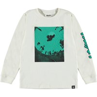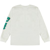 Rogert ist eine weiße Langarmbluse mit grünem Skate-Print auf der Vorderseite und Text auf dem linken Ärmel.