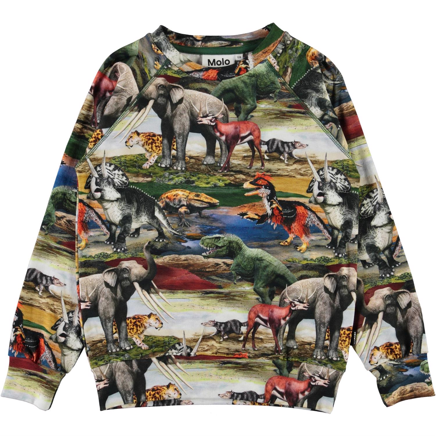 Romeo ist eine Pullover mit Aufdruck von der Welt und Tieren aus der Vergangenheit in schönen grünen und roten Farben. Romeo hat Raglanärmel und Rippkante an den Ärmeln und der Taille. Ecocert Greenlife, certifikationsnr. 197496.