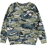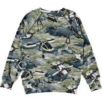 Romeo ist eine Bluse mit Druck von fliegenden Autos der Zukunft. Romeo hat Raglanärmel und Rippkante an den Ärmeln und der Taille.  Ecocert Greenlife, certifikationsnr. 197496.