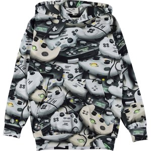 Romo ist ein Hoodie mit Kängurutasche und Aufdruck von Gaming-Controllern.