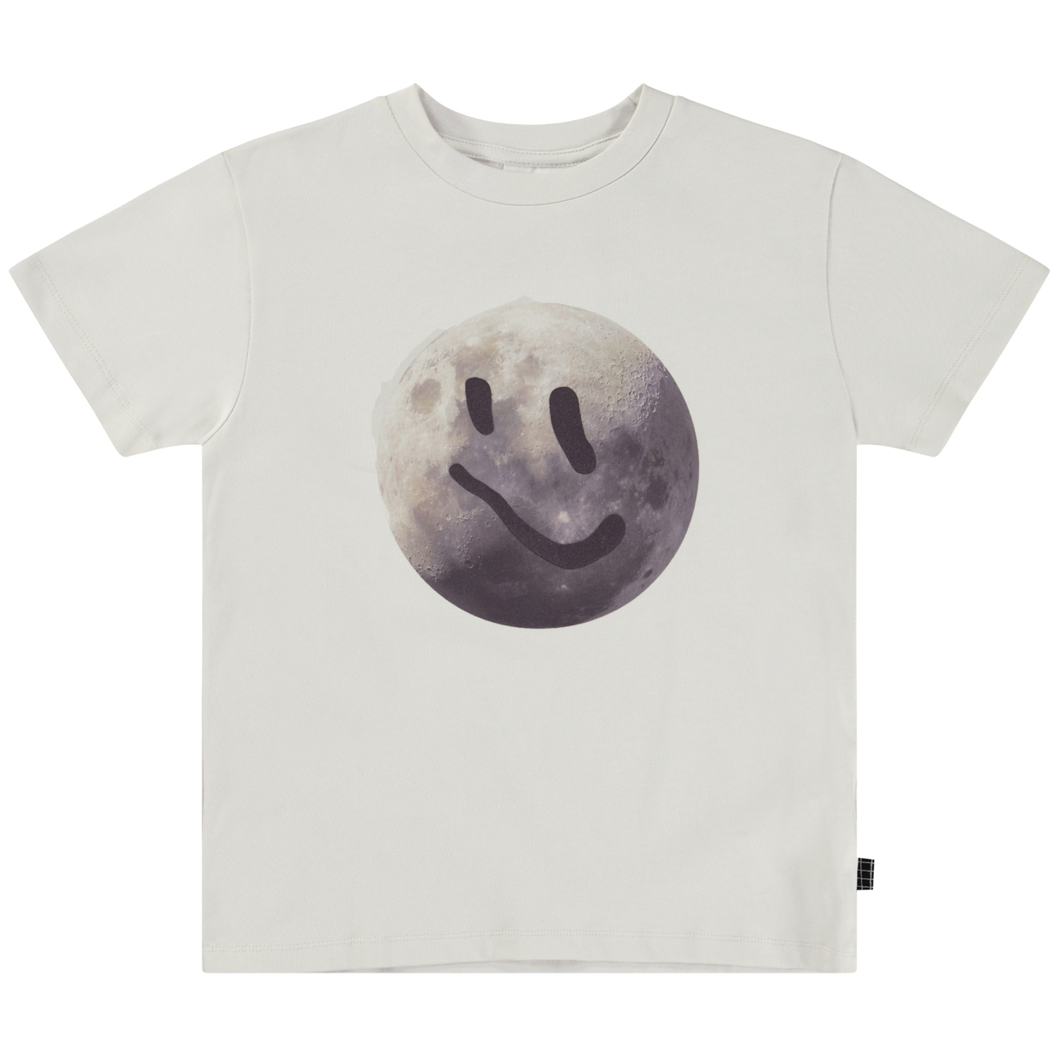 Weißes T-Shirt mit Frontdruck eines fröhlichen Vollmonds in Grautönen. Dieses T-Shirt besteht aus 100% Öko-Baumwolle, hat kurze Ärmel, einen Rundhalsausschnitt mit gerippten Bündchen und eine normale Passform.