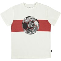 Roxo ist ein weißes T-Shirt mit Fußballaufdruck und dem Text „On world“.