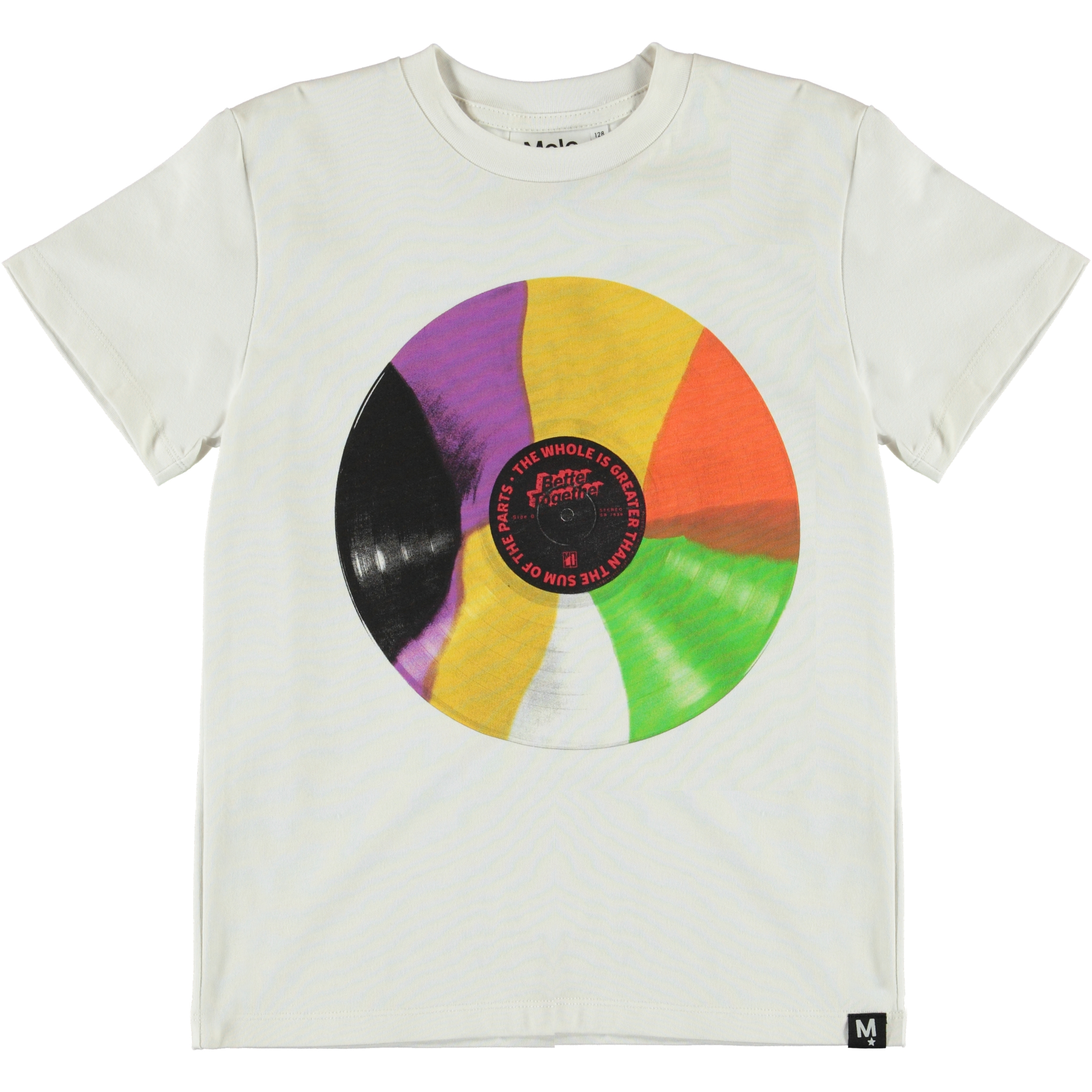 Roxo ist ein weißes T-Shirt mit einer farbigen Platte auf der Vorderseite.