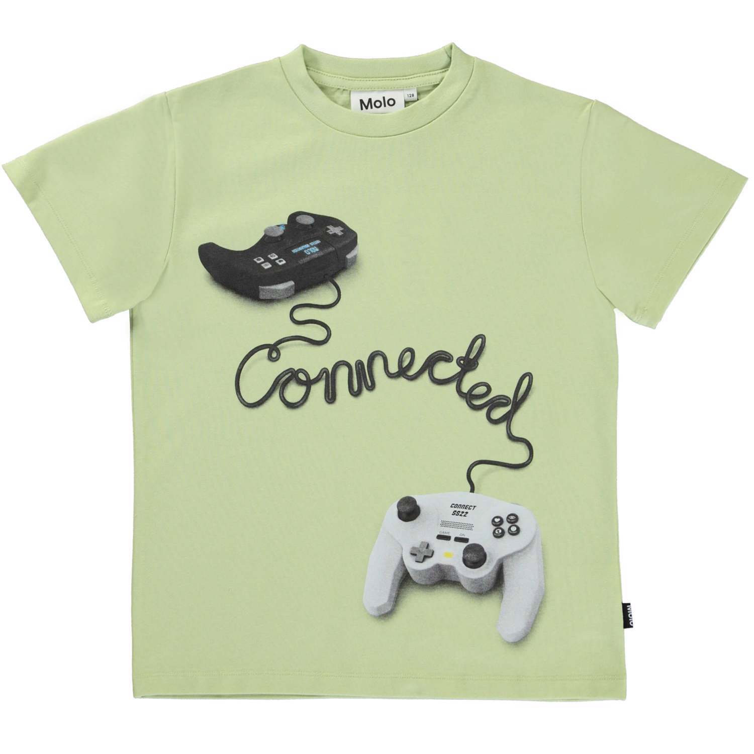 Roxo ist ein grünes T-Shirt mit 2 verbundenen Controllern. Die Leitung zwischen den beiden buchstabiert "Connected".