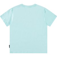 Hellblaues Öko-Baumwoll-T-Shirt mit kurzen Ärmeln und geripptem Ausschnitt. Das T-Shirt hat eine lockere Passform mit einem Frontdruck von kampfbereiten Dinosauriern.