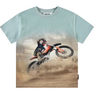 Blaues T-Shirt aus Öko-Baumwolle mit kurzen Ärmeln und geripptem Ausschnitt. Das T-Shirt hat eine lockere Passform mit einem Frontdruck eines Motocross-Fahrers in voller Fahrt.