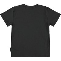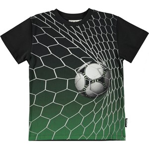 Roxo ist ein schwarzes T-Shirt mit dem Aufdruck eines Fußballtors und eines Fußballs.