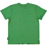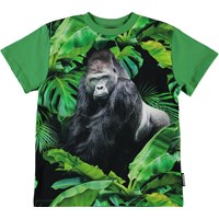 Roxo ist ein grünes T-Shirt mit Druck eines großen Gorillas auf der Vorderseite. Ecocert Greenlife, certifikationsnr. 197496.
