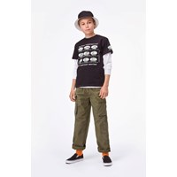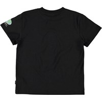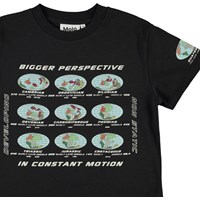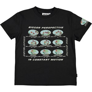 Roxo ist ein schwarzes T-Shirt mit verschiedenen Drucken von der Erde, die zeigen wie sich die Kontinente bewegen, da nichts statisch ist, sondern sich ständig ändert und in Bewegung ist. Ecocert Greenlife, certifikationsnr. 197496.