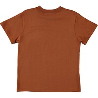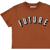 Roxo ist ein braunes T-Shirt mit dem Text 'Future' auf der Vorderseite.