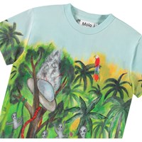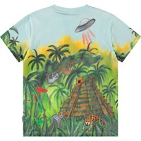 Hellblaues T-Shirt aus Öko-Baumwolle mit kurzen Ärmeln und geripptem Ausschnitt. Das T-Shirt hat eine lockere Passform mit einem Druck eines bunten Dschungels mit Aliens und UFOs.