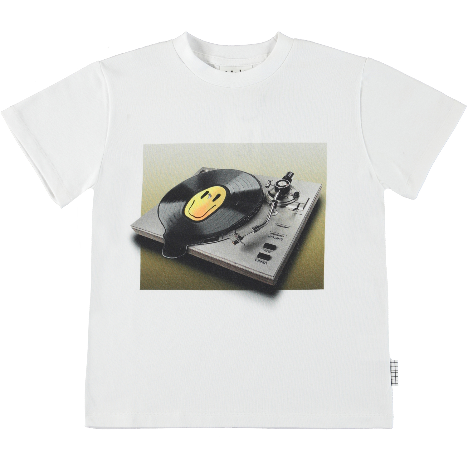 Roxo ist ein weißes T-Shirt mit einem Plattenspieler-Print auf der Brust. Die Platte auf dem Plattenteller ist so heiß geworden, dass sie schmilzt.