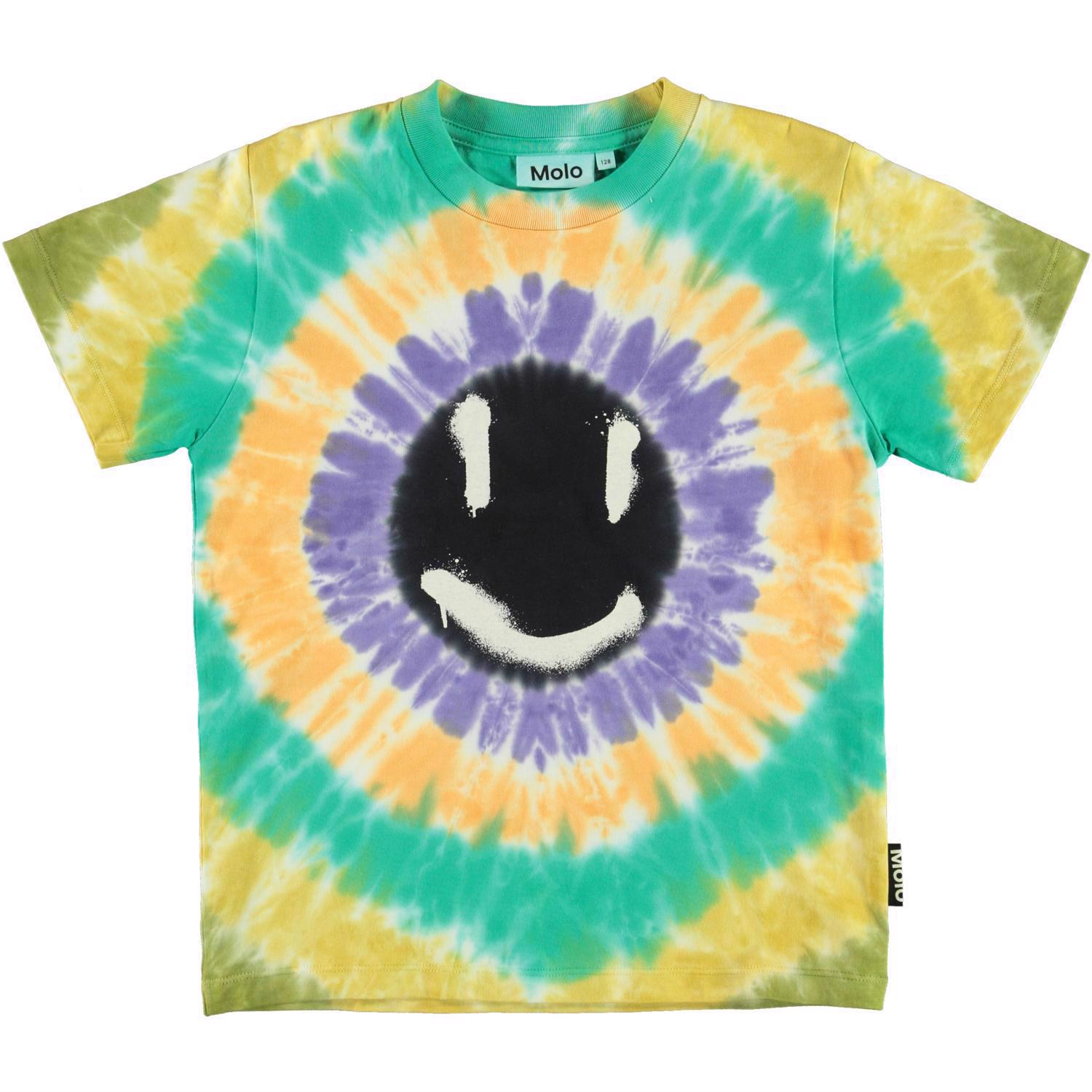 Roxo mit dem Aufdruck "Multi Happy" ist ein T-Shirt mit Batik in fröhlichen Farben und mit einem getaggten Smiley in der Mitte.