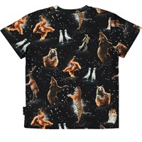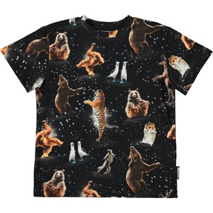 Roxo ist ein schwarzes T-Shirt mit Prints verschiedener Tiere, die in Partylaune sind. Sowohl der Bär als auch die Pinguine, Tiger, Affen und viele andere Tiere tanzen frei herum.