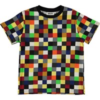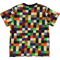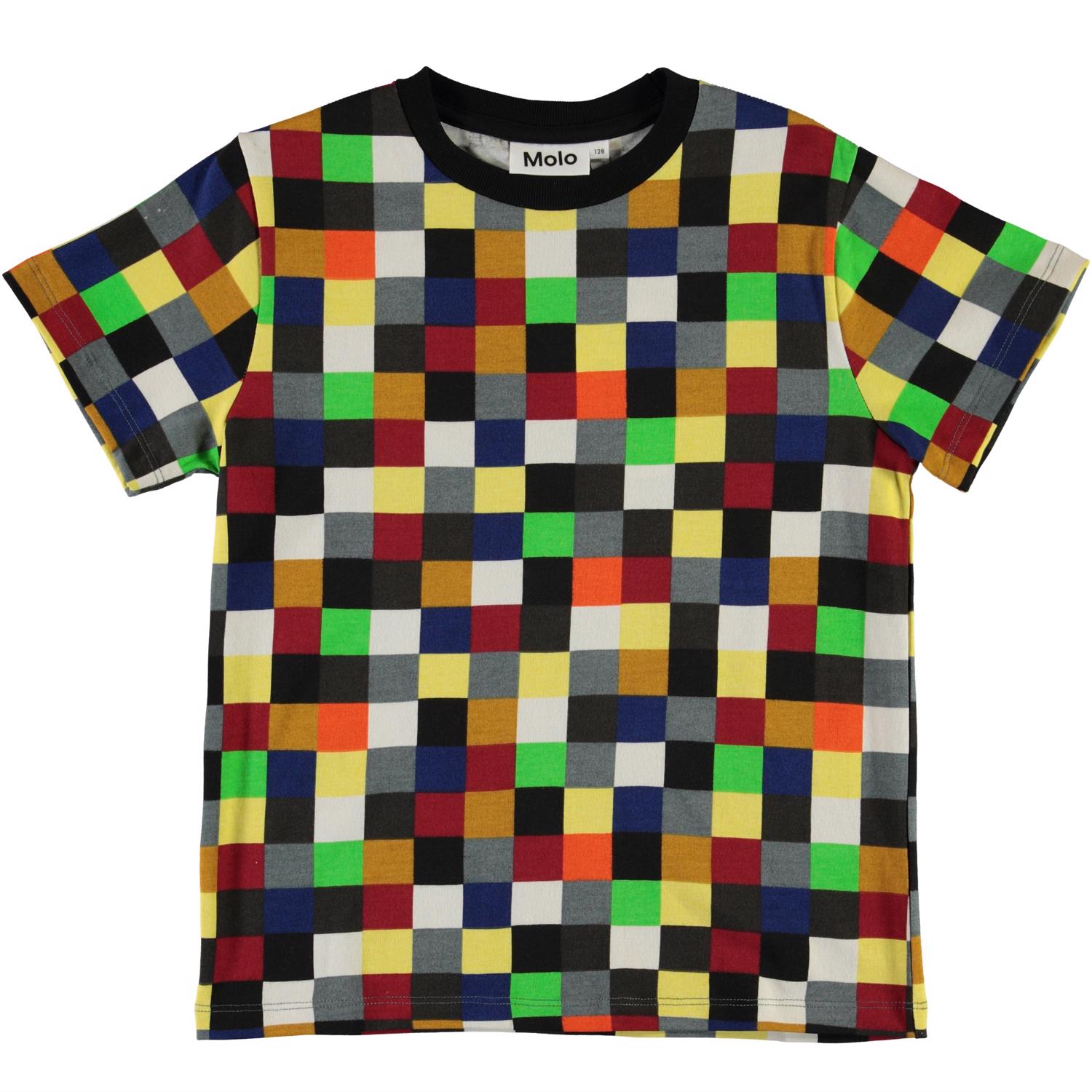 Der Druck auf dem Roxo-T-Shirt hat schöne farbige Felder, mit vergrößerten Pixeln. Das T-Shirt hat ein schwarzes Band am Halsausschnitt.