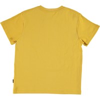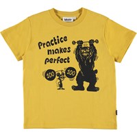Roxo ist ein gelbes T-Shirt mit kurzen Ärmeln und humorvollem Druck mit zwei gewichthebeenden Tieren und dem Text 'Practice maked perfect'.
