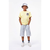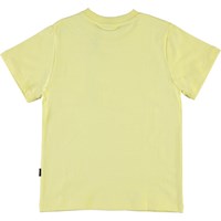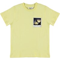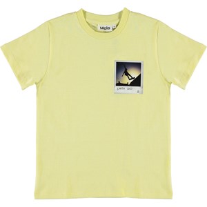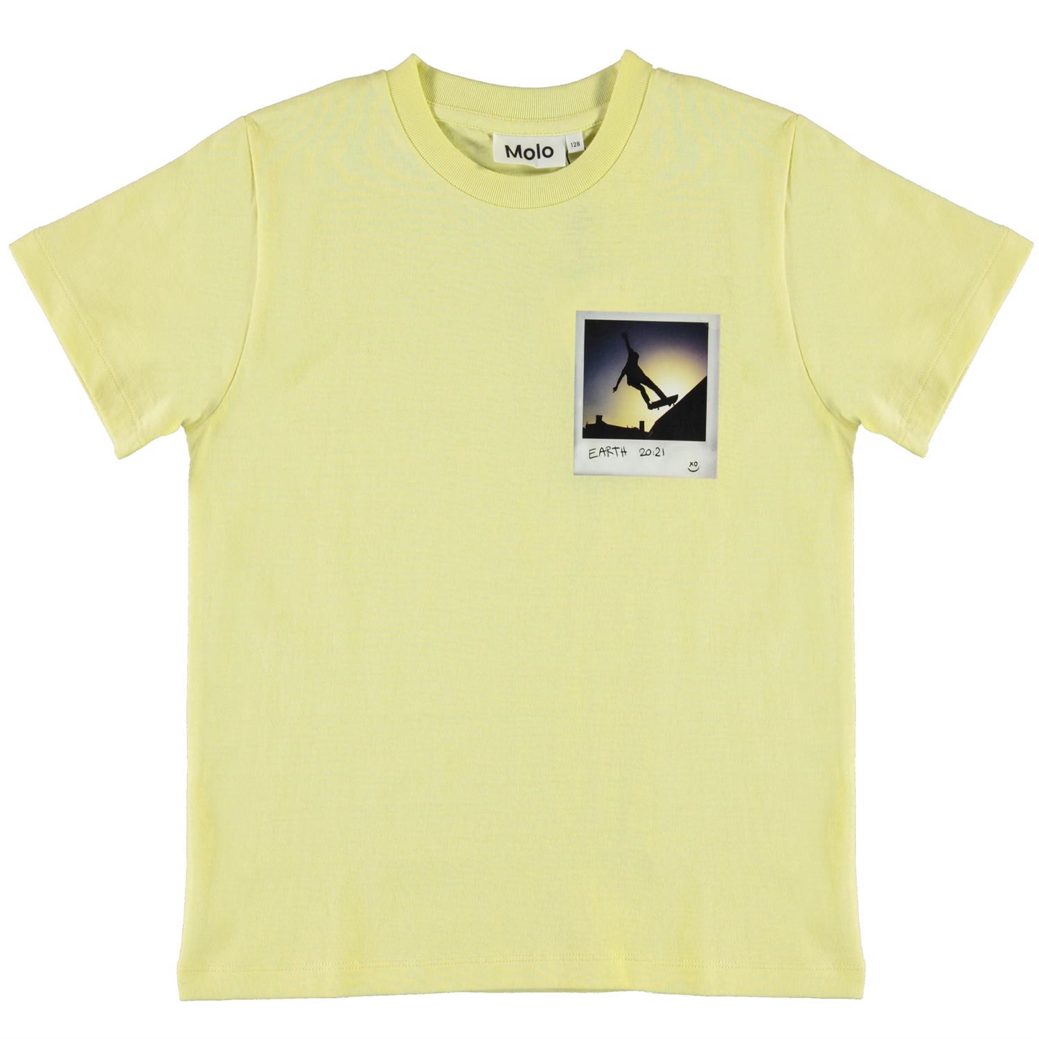 Roxo ist ein gelbes T-Shirt mit Aufdruck von Polaroid Fotos von Skatern auf der Brust.