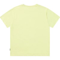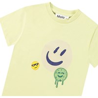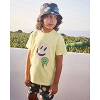 Gelbes T-Shirt aus Öko-Baumwolle mit kurzen Ärmeln und geripptem Ausschnitt. Das T-Shirt hat eine lockere Passform und einen Frontdruck mit lächelnden Gesichtern.