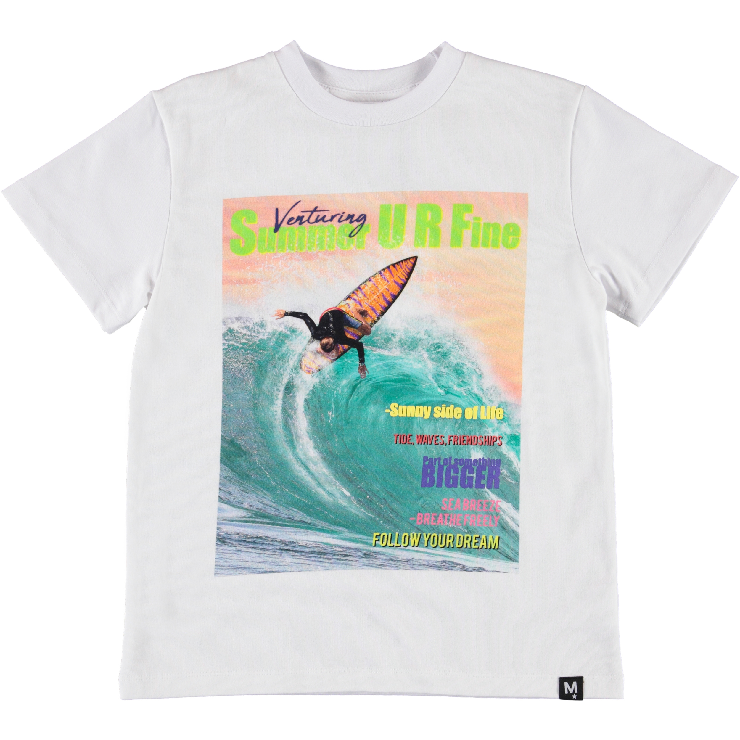 Roxo ist ein weißes T-Shirt mit Surf-Print auf der Vorderseite. Roxo ist aus 100% Baumwolle und hat kurze Ärmel.