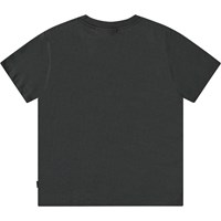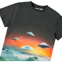 Öko-Baumwoll-T-Shirt mit kurzen Ärmeln und geripptem Ausschnitt. Das T-Shirt hat eine lockere Passform mit einem Frontdruck von UFOs, die über einem üppigen Dschungel schweben.