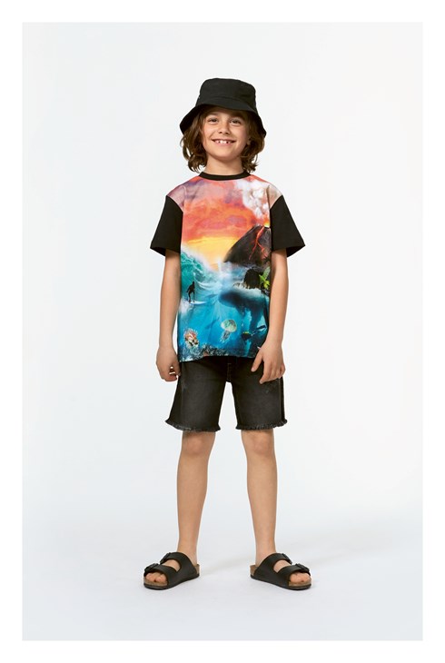 Roxo ist ein schwarzes T-Shirt mit dem Aufdruck "Wild Island", das die wilde Seite der Insel zeigt.