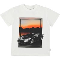 Roxo ist ein weißes T-Shirt mit dem Bild eines Rennwagens in einem Sonnenuntergang auf der Brust.