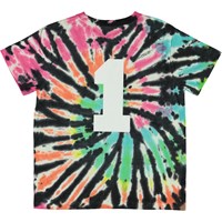 Roxo ist ein mehrfarbiges Batik-T-Shirt mit einer großen Zahl '1' auf der Rückseite.