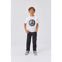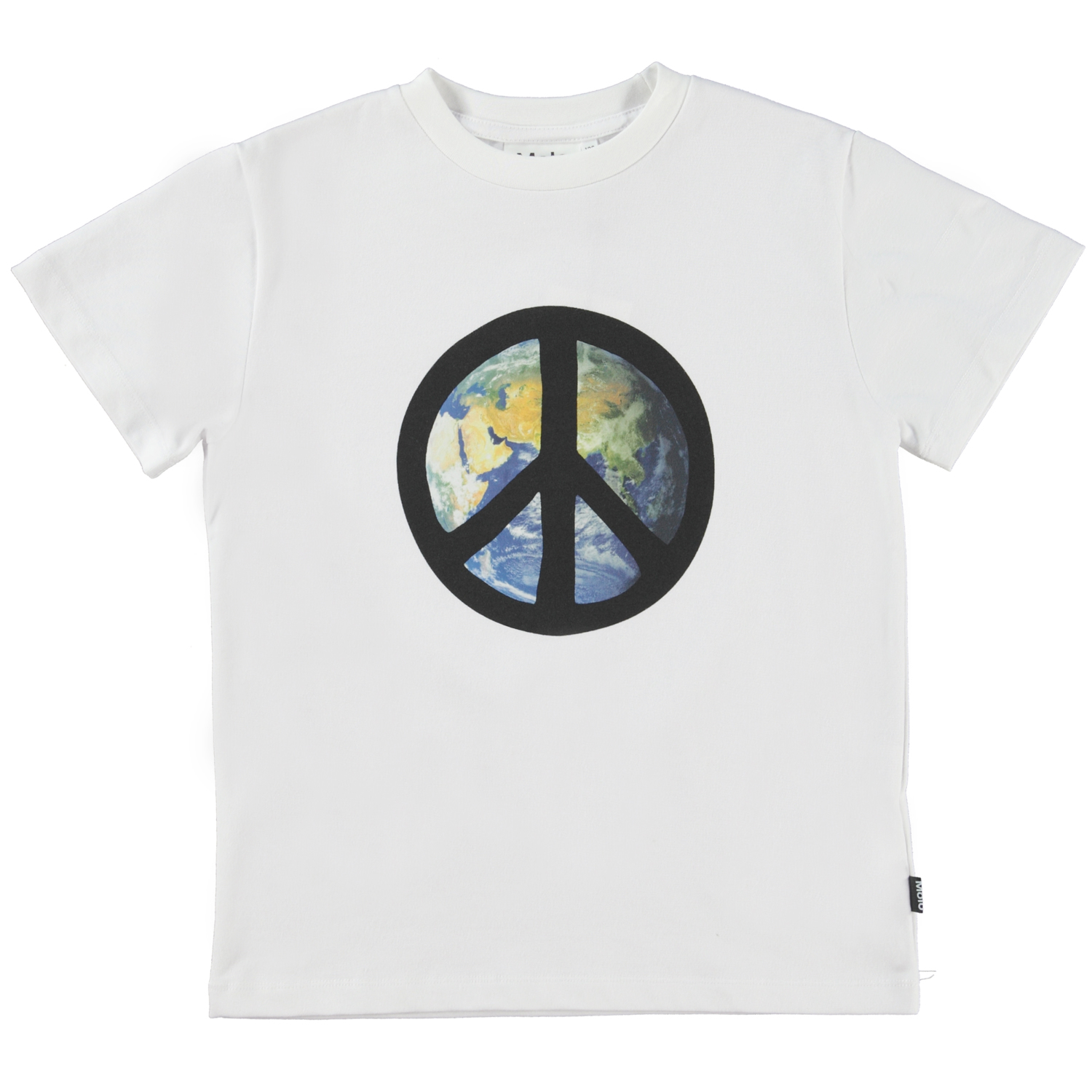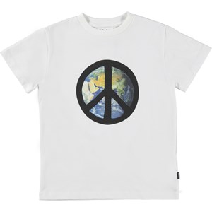 Roxo ist ein weißes T-Shirt aus Öko-Baumwolle. Auf der Vorderseite hat Roxo einen Globus mit einem Peace-Zeichen darauf gedruckt.